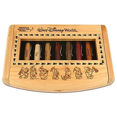 - Set includes elegant wood display case with inlaid pattern and etched artwork of Dopey, Grumpy, Happy, Sneezy, Sleepy, Bashful and Doc, plus ”Whistle While You Work” and ”Walt Disney World”