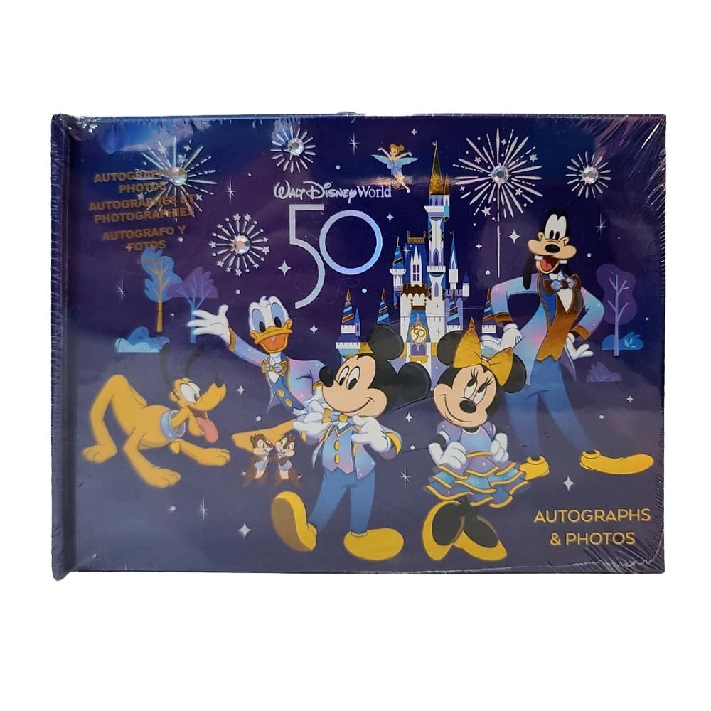 Mickey and his friends celebrate the 50th Anniversary of Walt Disney World with this Walt Disney World 50th Anniversary autograph book. The cover shows the team pictured in front of Cinderella Castle in their Anniversary gear with the 50th logo, while the reverse features a circle of Disney characters surrounding the 50th logo. Faux gems add to the dazzling celebration on the front cover!