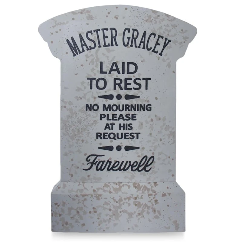 ”Master Gracey laid to rest – no mourning please at his request.” Bid farewell to the former occupant of The Haunted Mansion with this tombstone replica made of soft plastic for displaying indoors or planting (with included stakes) in your own garden graveyard.