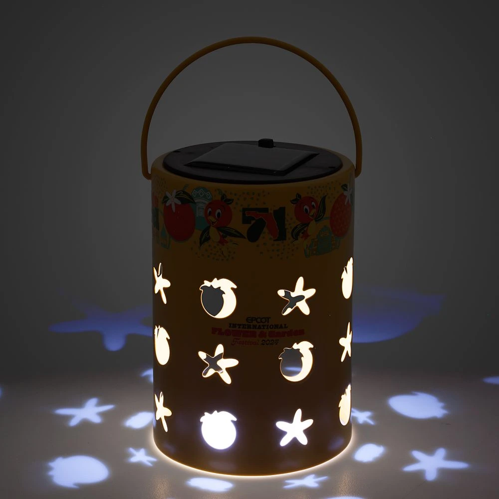 Keep memories of the EPCOT International Flower & Garden Festival 2024 shining year round with this Orange Bird solar lamp. The cylindrical metal design features cut-outs of Orange Bird and flowers that provide a decorative glow. The solar panel on the top means you’ll never need to replace batteries, and its handle means it’s great to carry around or hang outside.
