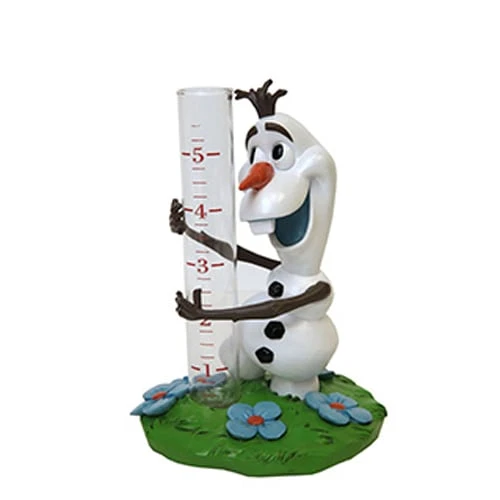 - Fully-sculptured, expressive Olaf holding glass rain gauge
