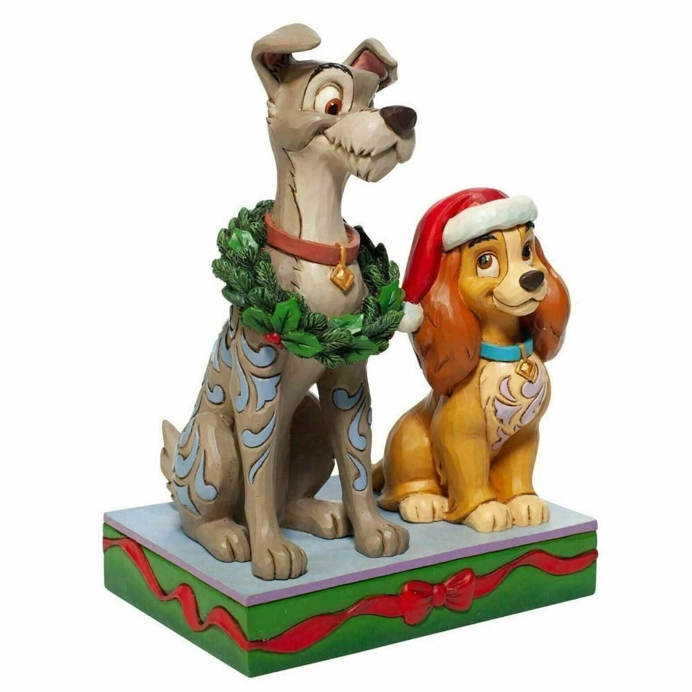 Lady and the Tramp strike a festive pose in this charming statuette. Lady wears a Santa hat strikingly, while Tramp proudly sports a wreath. The romantic pair make the season sweeter.