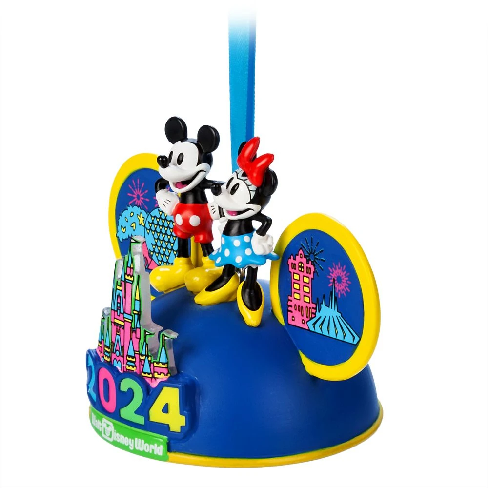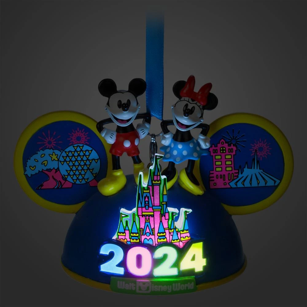 Mickey and Minnie tip their toppers to 2024 on a contemporary ear hat ornament that will brighten every day of the year with magical memories of Walt Disney World Resort! 2024 logo lights up the night!